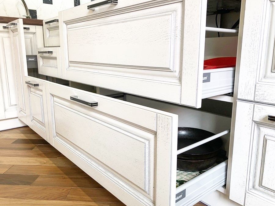 Матовая кухня г-образной формы в стиле Классика с патиной. Фасады: МАССИВ ЯСЕНЯ. Фурнитура – BLUM, столешница – Эггер (Egger).